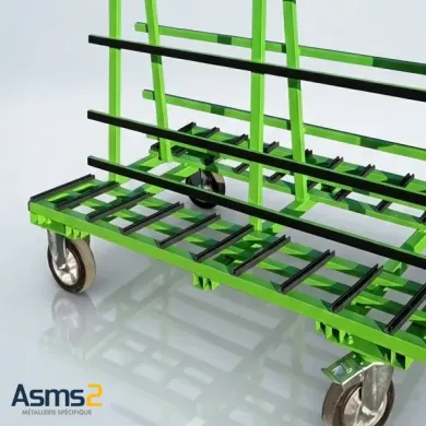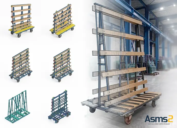 Nous fabriquons et adaptons des équipements de manutention adaptés à vos contraintes terrain : chariots verriers, pupitres, palettes, porte-profils pour la menuiserie, chevalets, chariots harpe et solutions sur mesure.